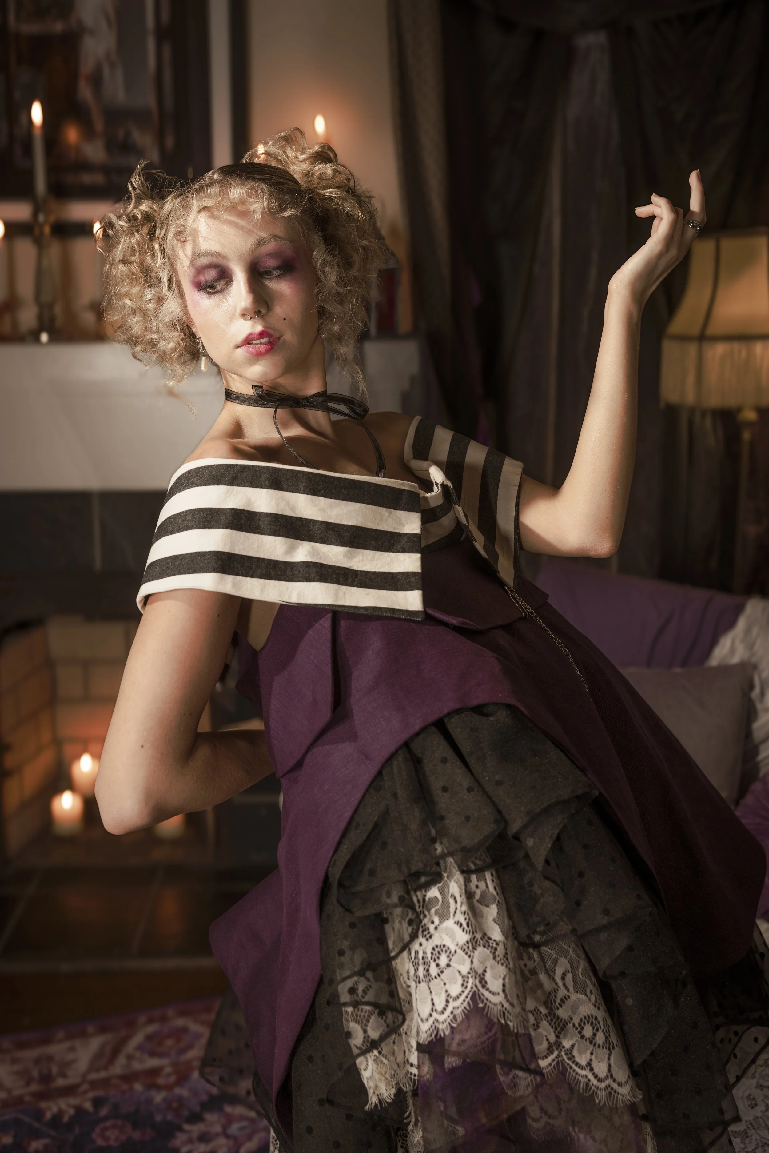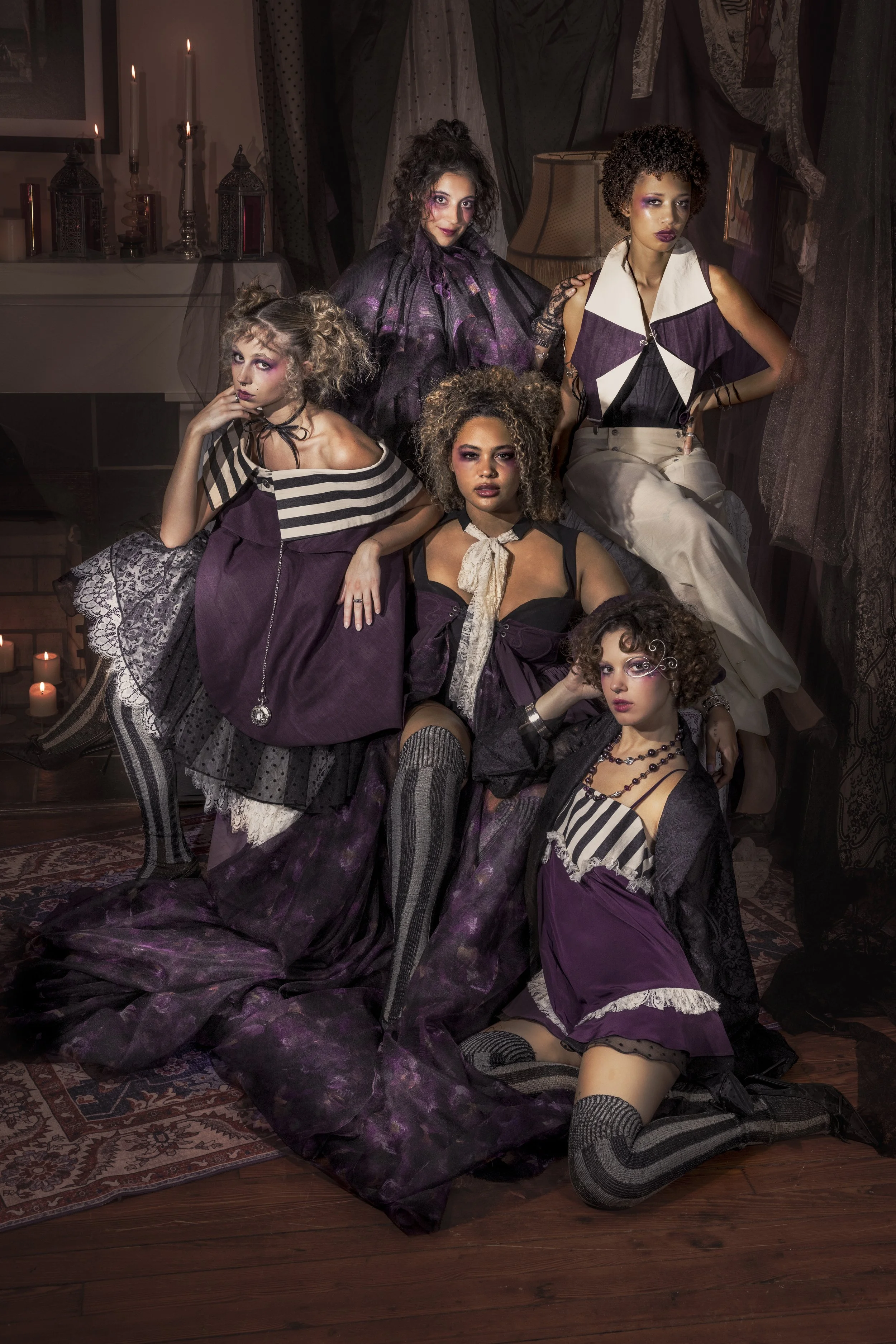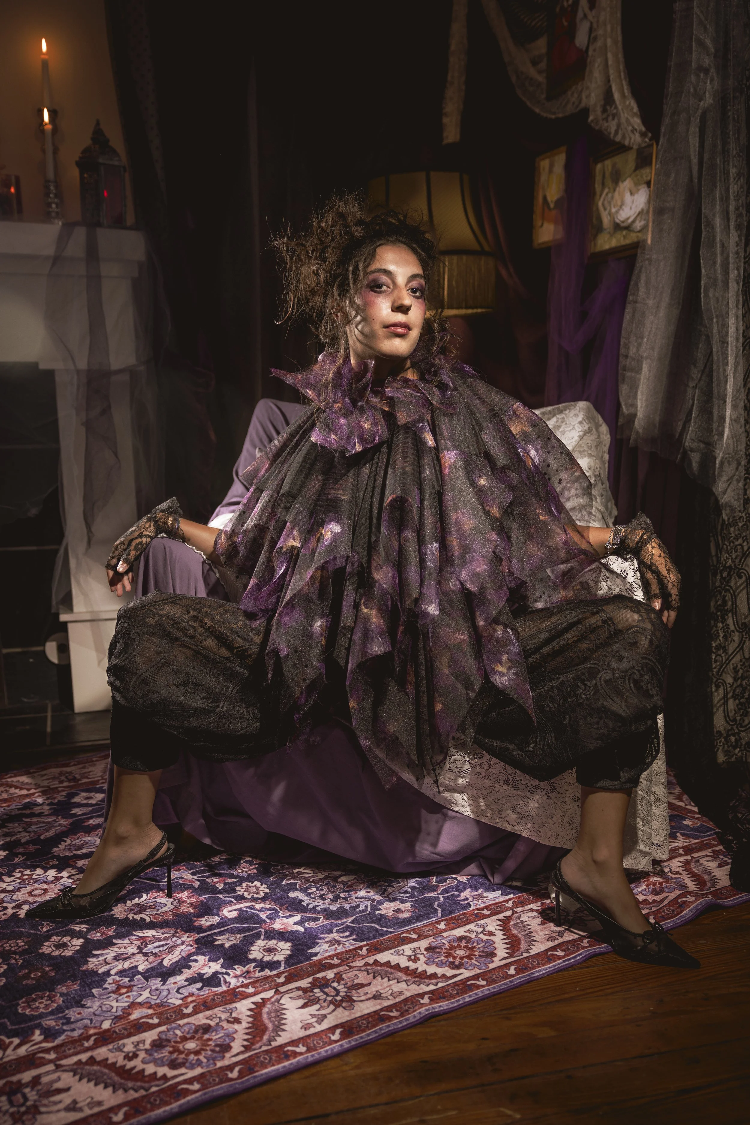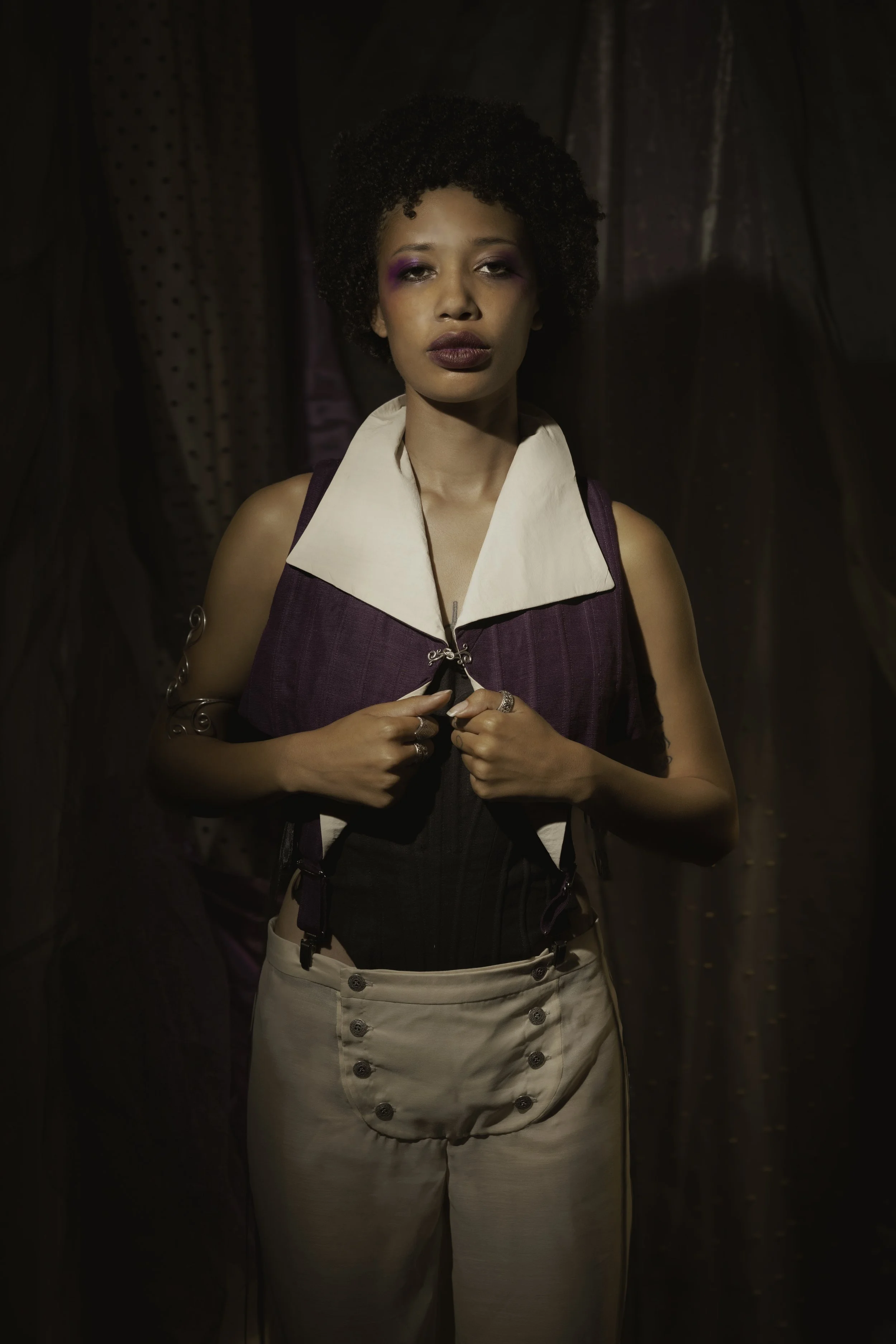 La Vie En Violette is a collection that honors the lives, loves, and deep friendships within the underground community of fin de siècle France, known as Paris Lesbos. This collection seeks to preserve the history of queer women and celebrate lesbian identity through fashion. It explores the stories of remarkable women—artists, poets, authors, courtesans, and performers—who gathered in secret at lesbian salons, cabarets, and cafés to share culture and pay homage to Sappho. This collection reimagines the queer signaling fashions of Paris Lesbos for the modern queer woman, allowing her to express her identity and connect with a rich historical legacy.