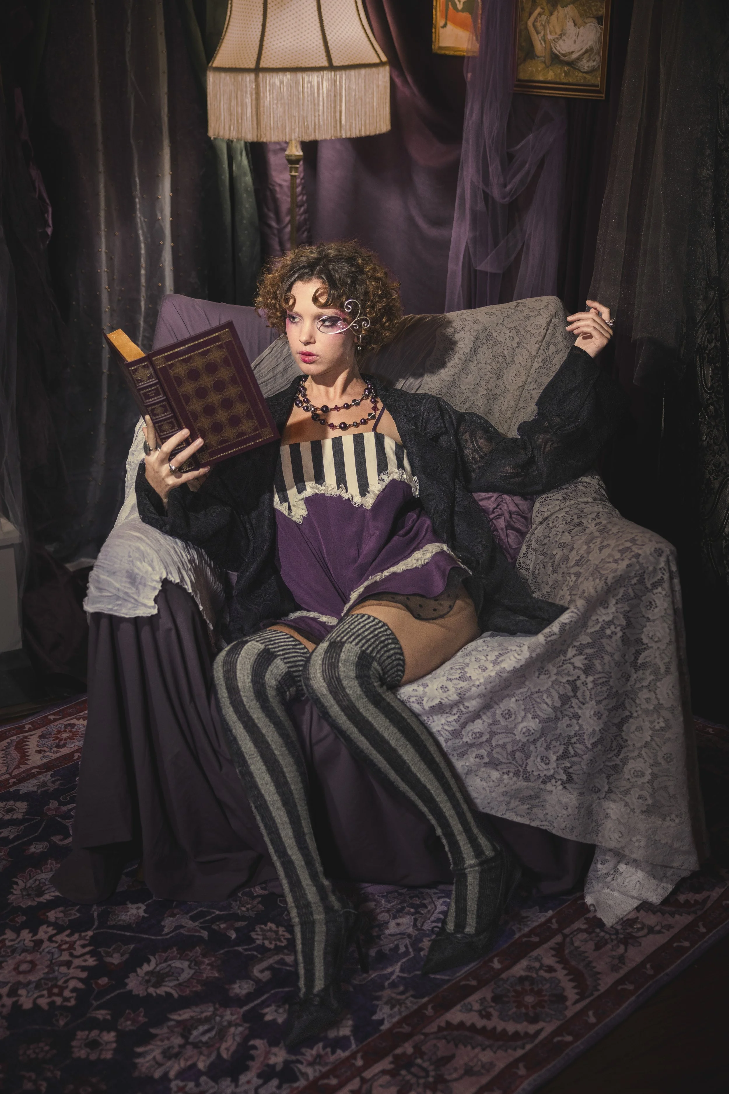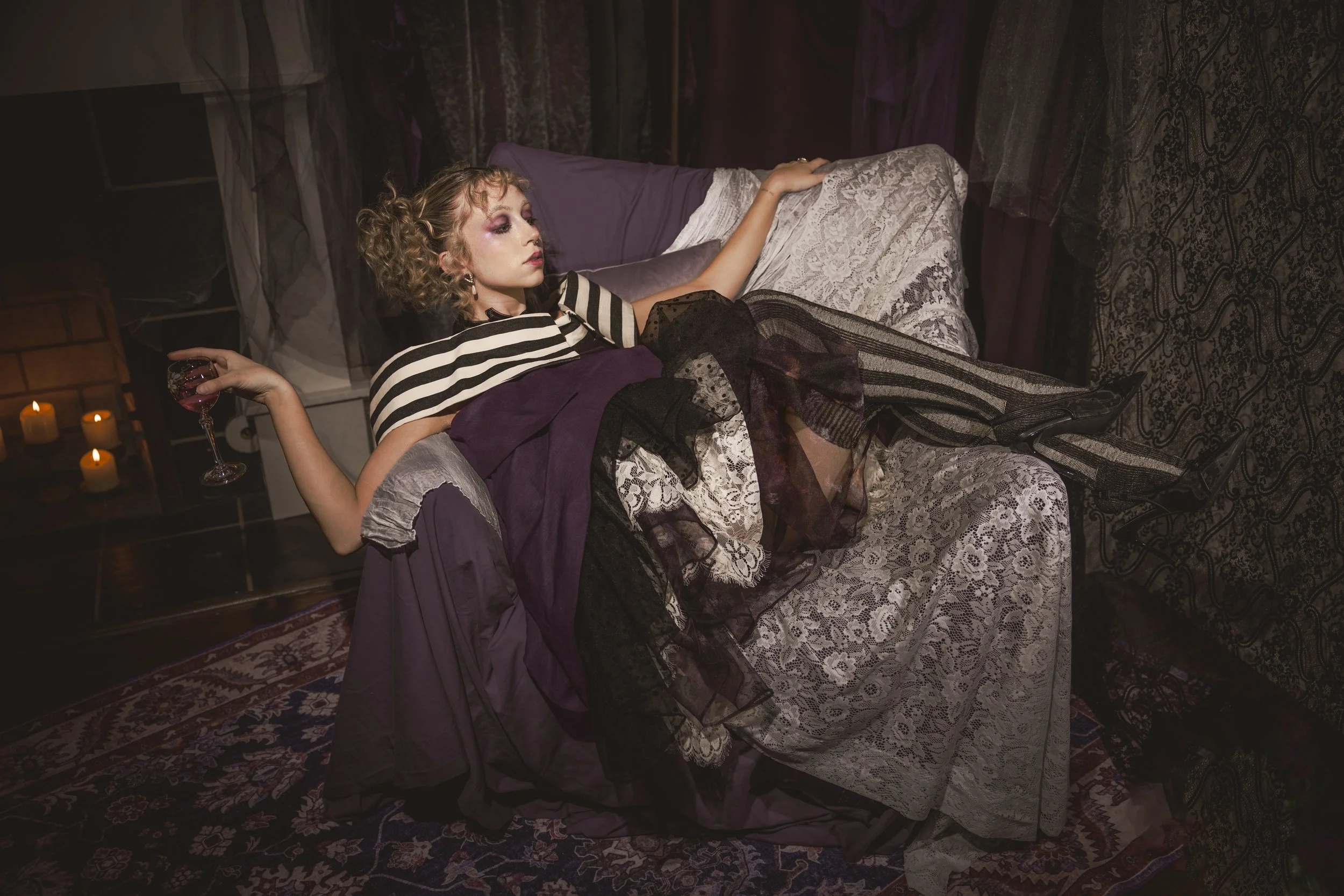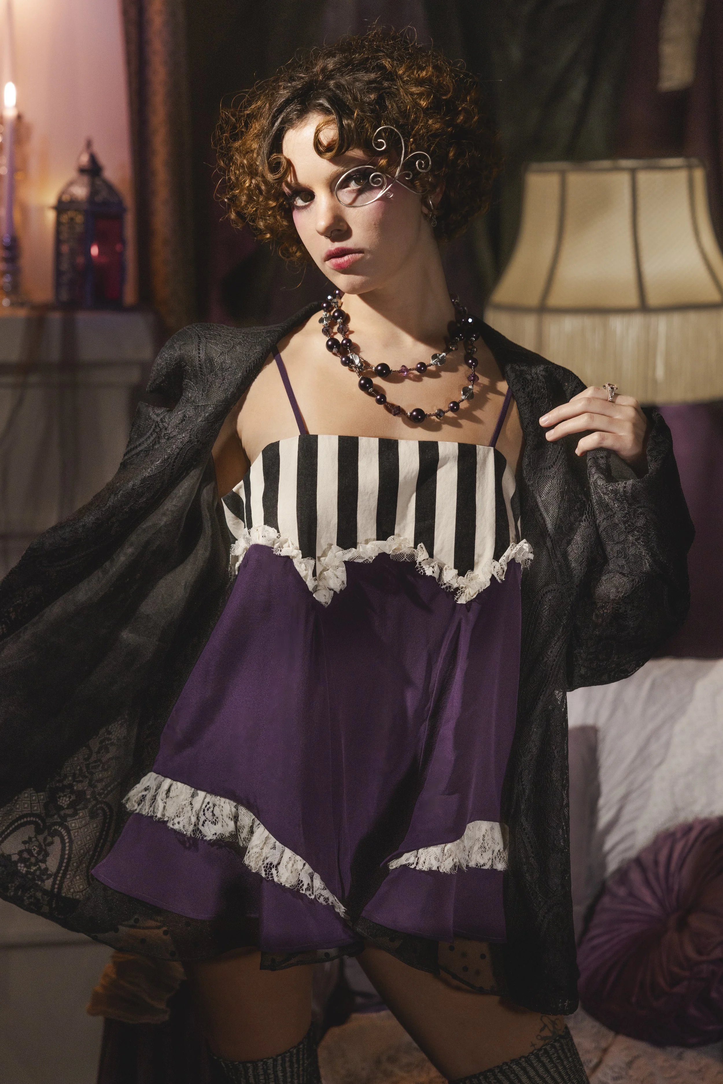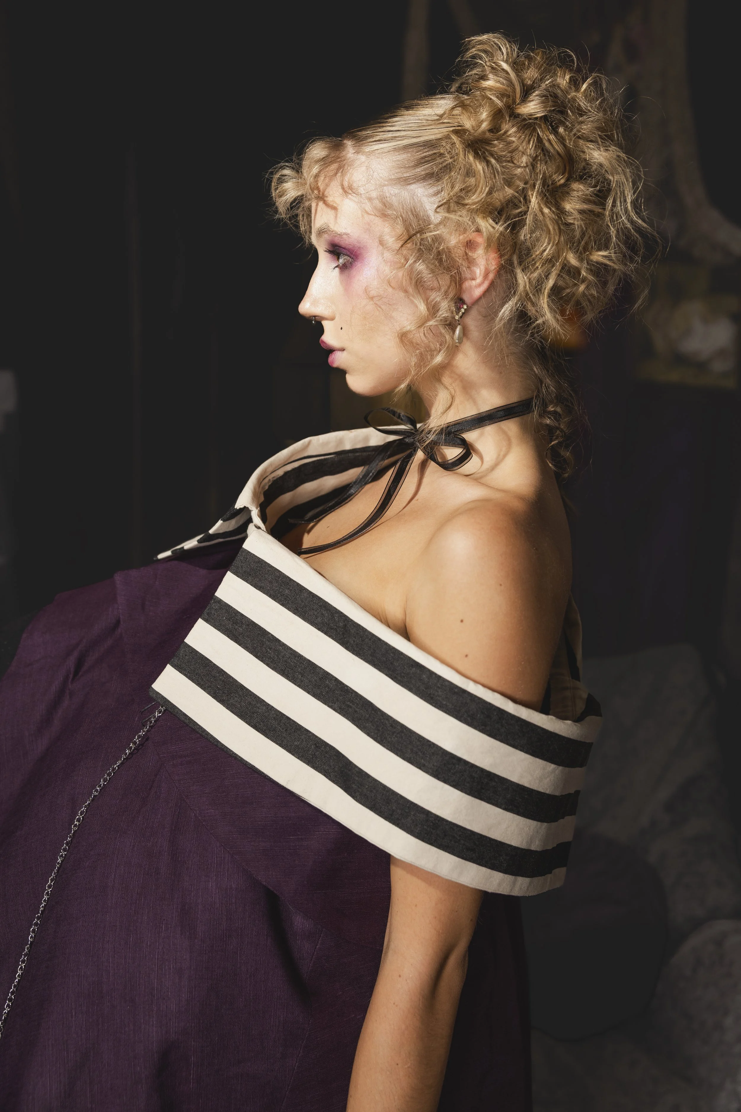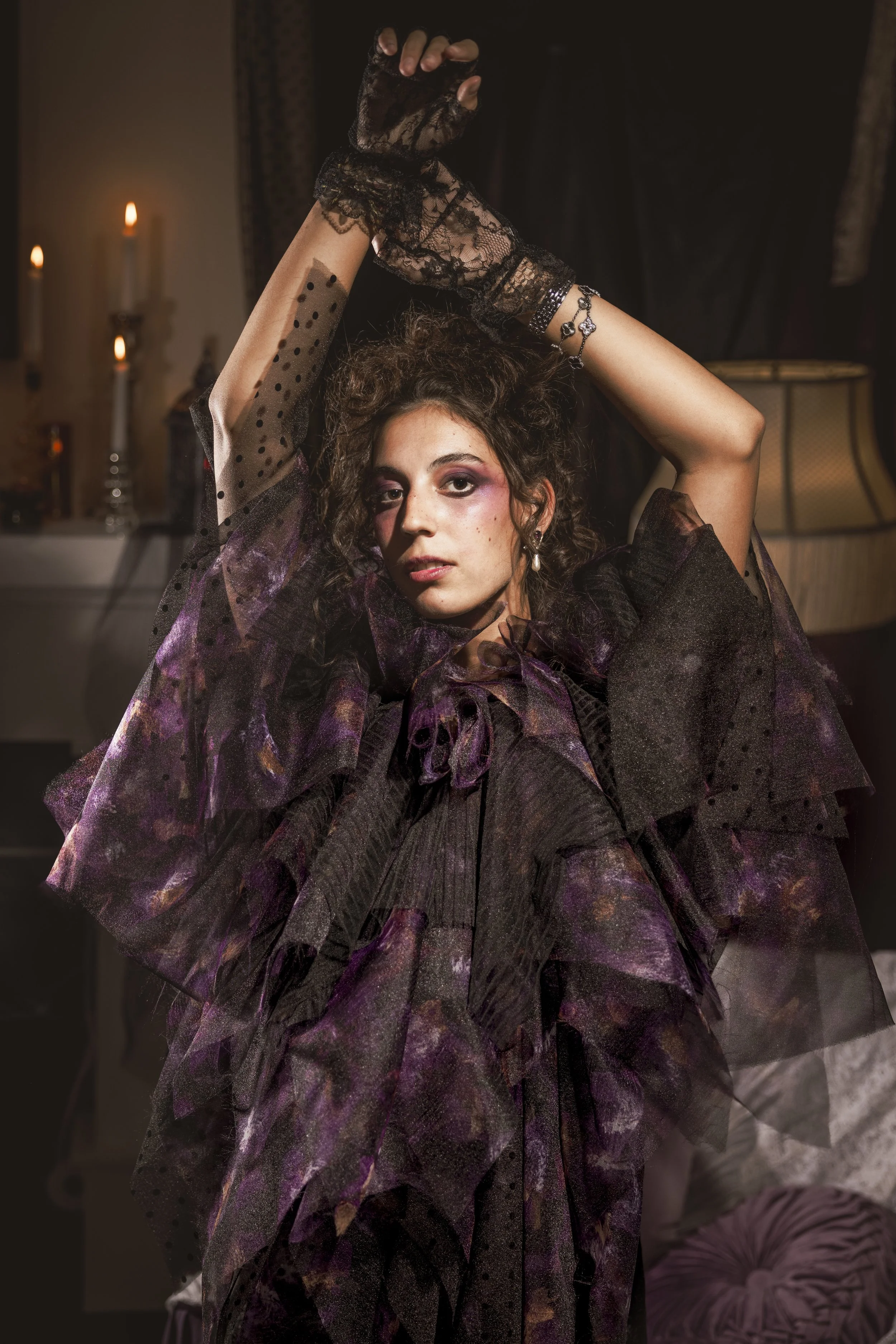 La Vie En Violette is a collection that honors the lives, loves, and deep friendships within the underground community of fin de siècle France, known as Paris Lesbos. This collection seeks to preserve the history of queer women and celebrate lesbian identity through fashion. It explores the stories of remarkable women—artists, poets, authors, courtesans, and performers—who gathered in secret at lesbian salons, cabarets, and cafés to share culture and pay homage to Sappho. This collection reimagines the queer signaling fashions of Paris Lesbos for the modern queer woman, allowing her to express her identity and connect with a rich historical legacy.